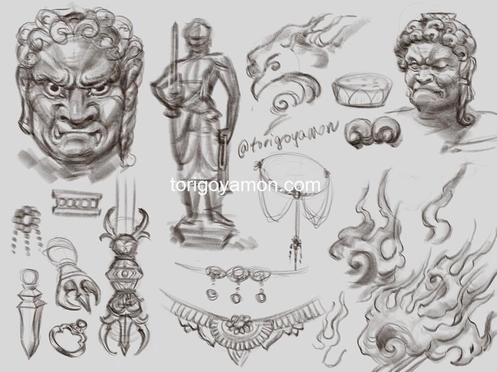 I’ve included some studies of existing Buddhist artworks I did before working on the sculpture.