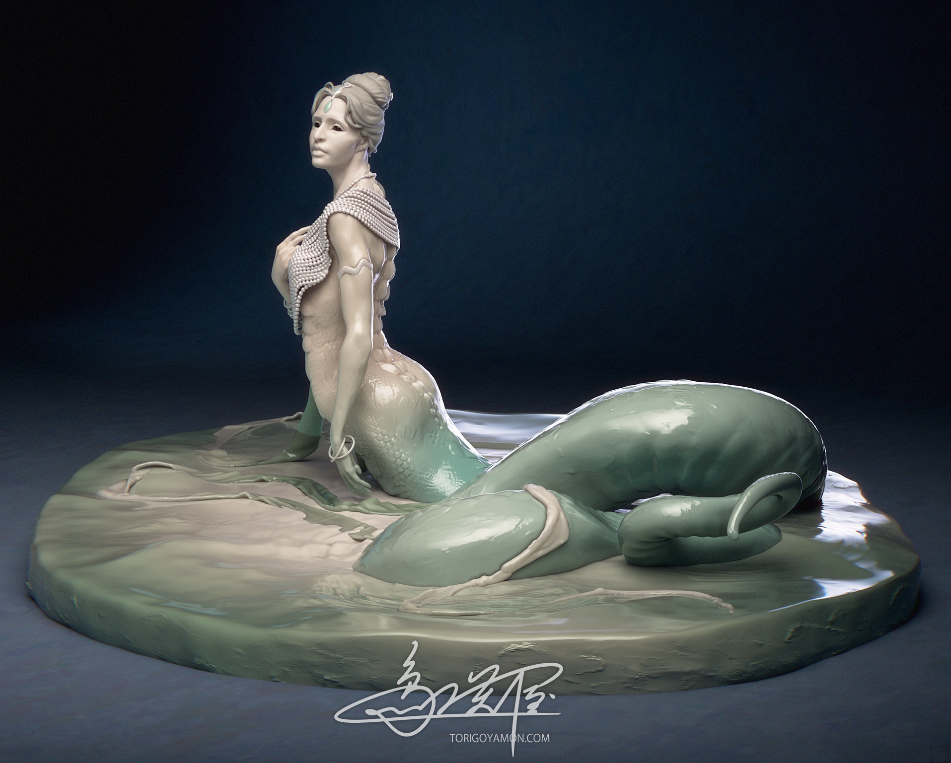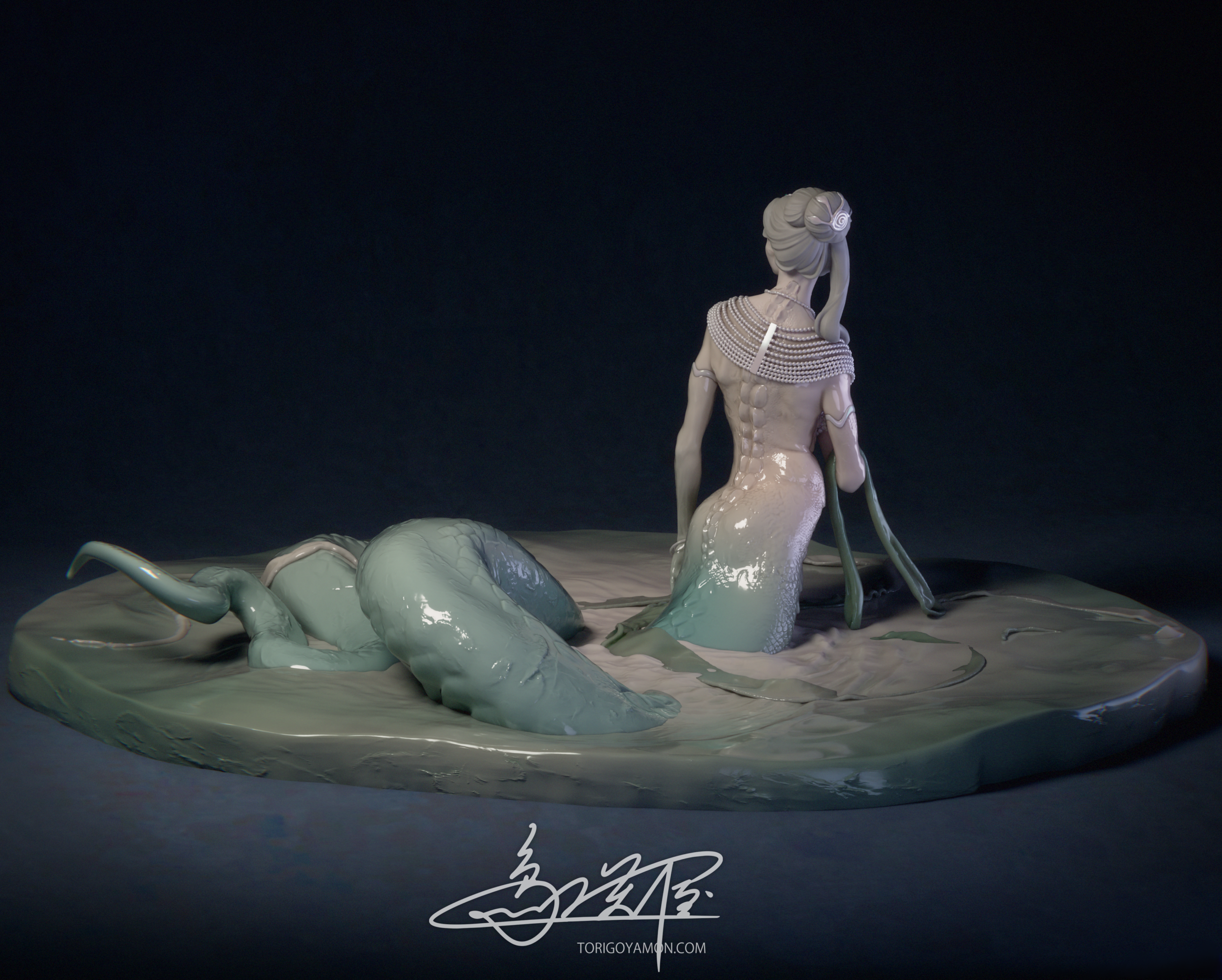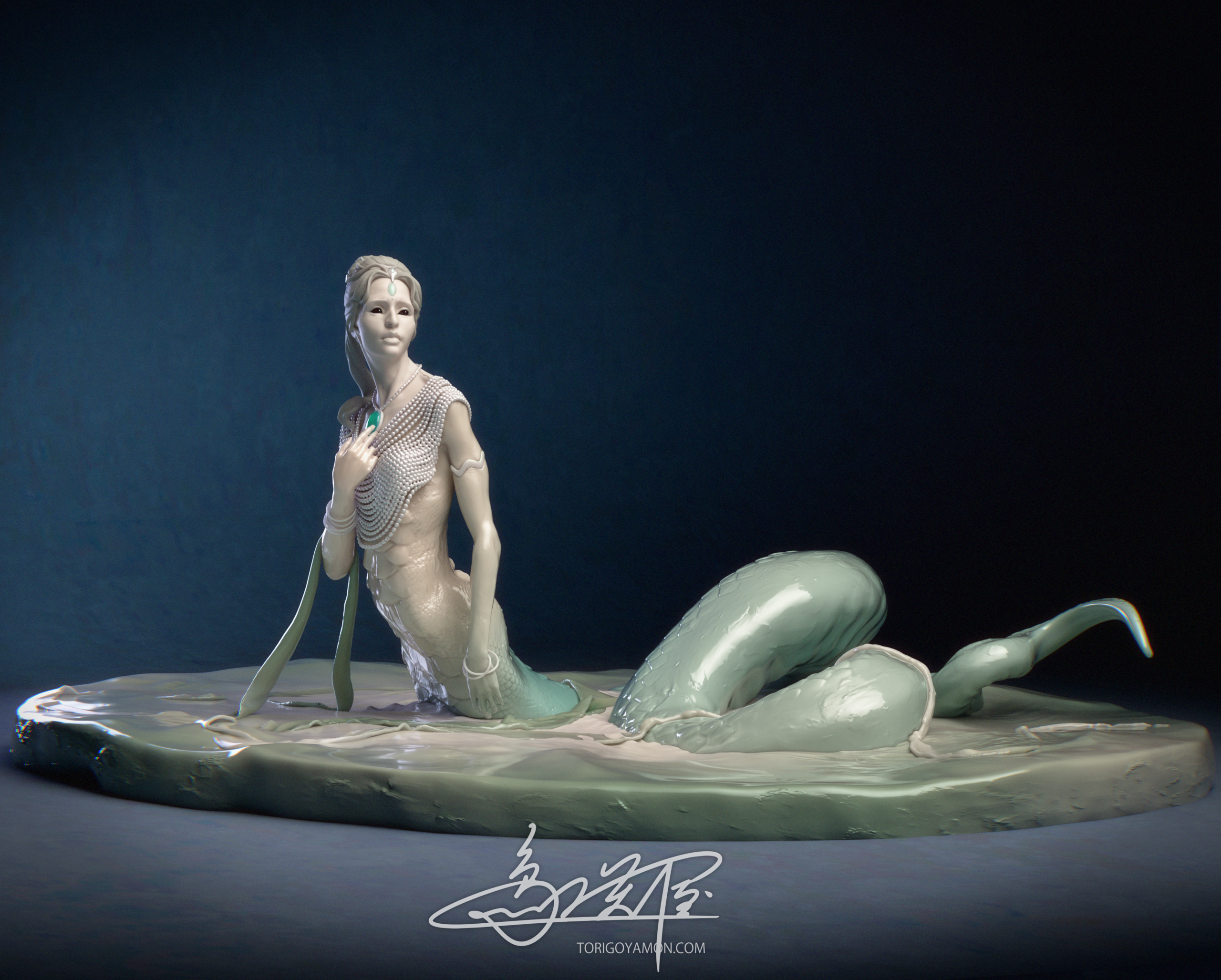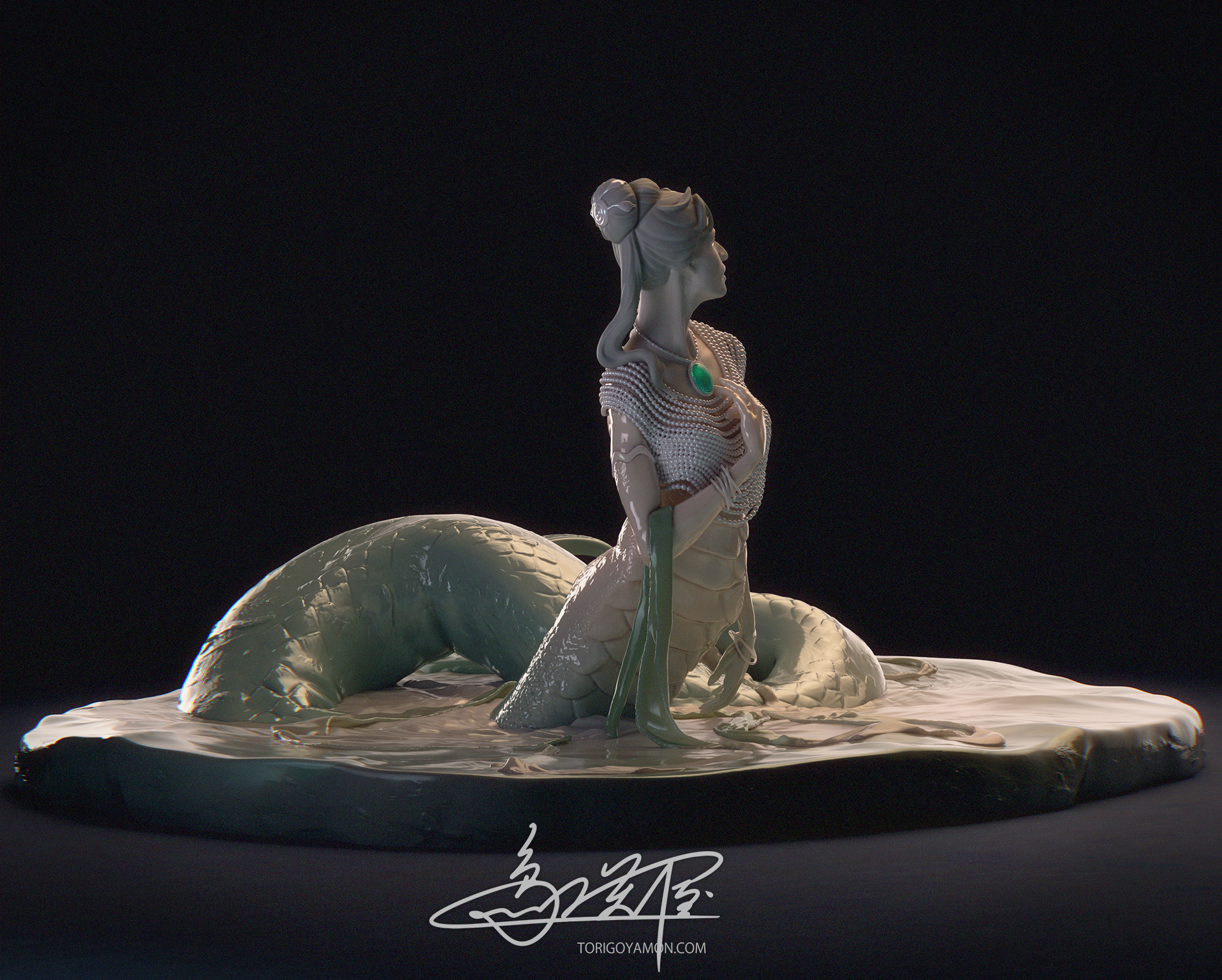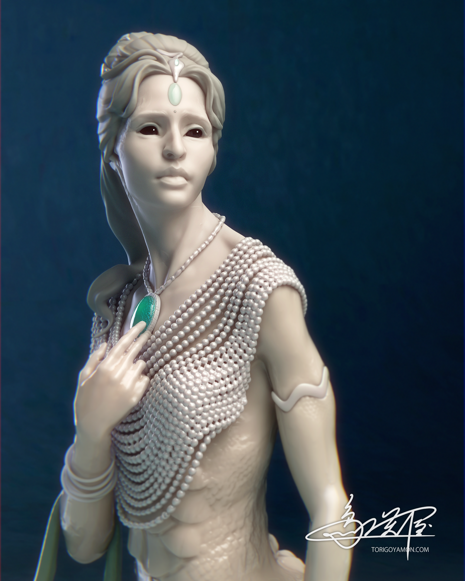 The jewels, the Naga Mani on her forehead and the Sanjivani Mani at her necklace, were originally envisioned as milky-opalescent gemstones with prismatic light. But in the end, I shifted their material toward jade or emerald-like qualities. This remains one small point I hope to revisit in the future.